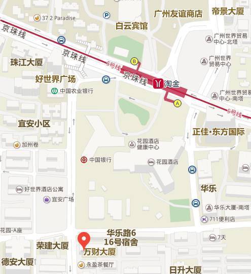路线举例:5号线淘金地铁出站(A出口 500m就到了)