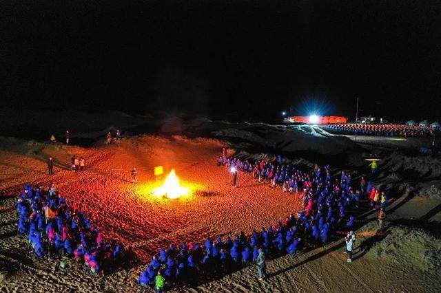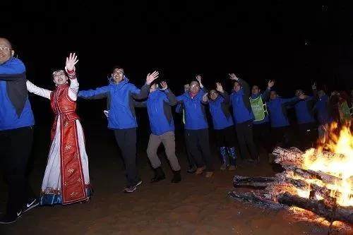 350人围坐在篝火旁,表演人员的天籁之声在耳边萦绕,队友携手在烈焰边舞蹈。