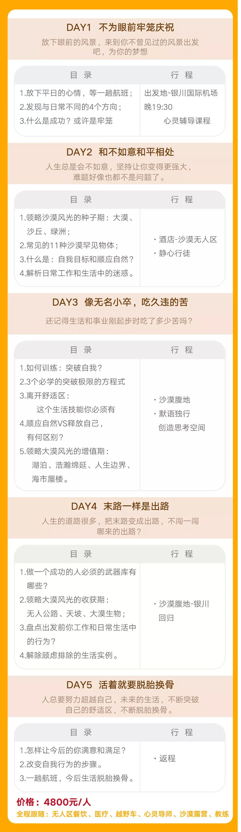 很多人把沙漠徒步比作一场修行,每个经历过的人,都有自己的收获,或是寻找到人生的正确方向、或是释放了自己放下过去……这场沙漠之旅就是要给你一次与自己对话的机会,置身沙漠用自由和发现的心,做最坚定的选择,发现自己更大的能量,重新出发。