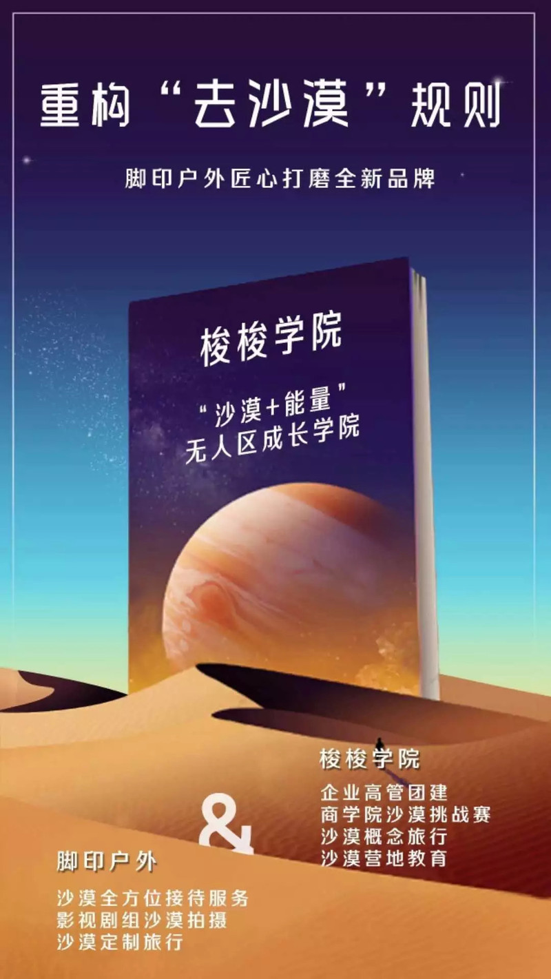 脚印户外11年来始终立足沙漠、扎根沙漠,并针对近年来户外领域的不断细分,创立了专为菁英人士打造的无人区成长学院——梭梭学院,其灵感来自于“沙漠植被之王”——梭梭树,它有着相当发达的根系,即使在极度缺水的环境里也能够茁壮成长。