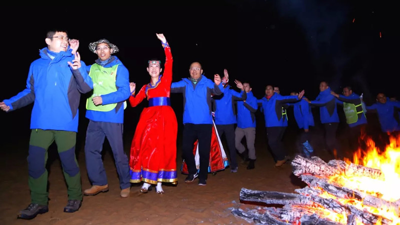 酒店自助早餐——抵达腾格里沙漠——出征仪式——午餐——徒步前往太阳湖营地——搭建帐篷———营地晚餐——篝火晚会