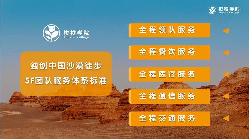 梭梭学院深耕沙漠十余年,独创了中国沙漠5F徒步体系,提供全程的领队、餐饮、医疗、通信以及交通服务,为您的安全保驾护航。